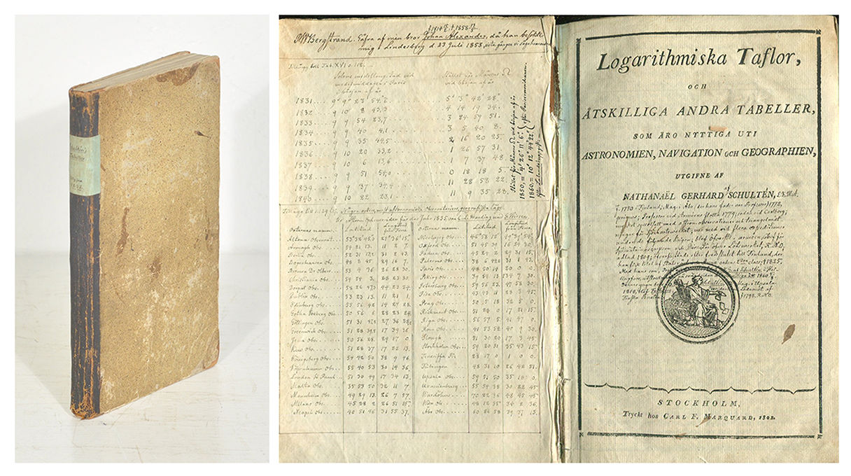 Sthlm, C. F. Marquard, 1802. 4:o. (6),176 s. Text och tabeller inom svart ramtryck. Enkelt samtida hfrbd med blå handskriven titeletikett klistrad över ryggen. Pärmarna med några fläckar och avnötta kanter samt stötta hörn. Enstaka fläckar, t.ex. en liten bläckfläck på titelbladet. Lång tillskrift om Schultén i diminutiv bläckskrift på titelbladet och lång anteckning av samma hand på sista sidan. Invikt yttermarginal på s. 107-12 med inlagd handskriven lapp ”Anm. till tabellen XVI”. Några bruna fuktfläckar på s. 169 varav en fortsätter till s. 176. I slutet medbundet tolv sidor handskrift ”Sol-tabeller utarbetade av P. W. Bergstrand 1842 och 1853”. Båda pärmarnas insidor fullskrivna med tabeller. Namnteckning P. W. Bergstrand med anteckningen ”Gåfva af min bror Johan Alexander f. 1814 d. 1858, då han besökte mig i Lindesberg d. 23 juli 1853, sista gången vi sågo hvarandra”. Även namnteckning Unonius på sista textbladet. Trevligt och intressant ex.