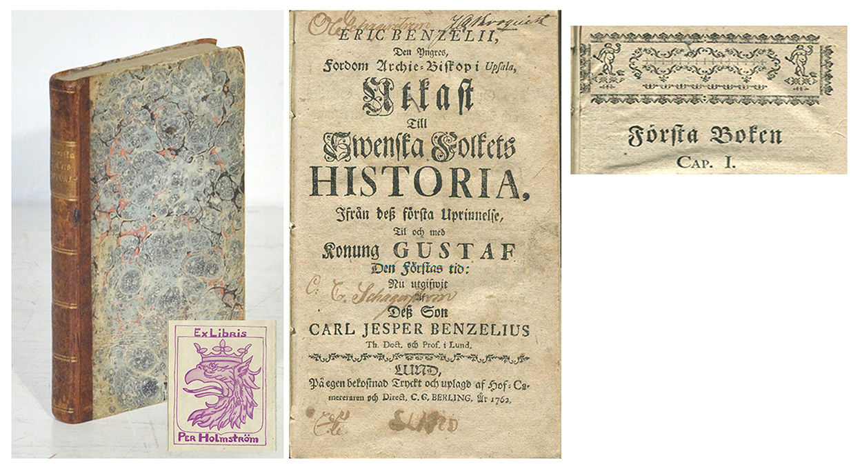 Lund, C. G. Berling, 1762. 8:o. (16),96,96-127,129-262,(2) s. Lätt nött stänkdekorerat hfrbd från ca 1800 med guldlinjerad rygg och olivgrön titeletikett. Gula snitt med röda stråk. Ställvis lagerfläckig och med några fuktränder. Några bockar och understrykningar i blyerts. Titelbladet med lätt solk och två namnteckningar av C. G. Schagerström. På bakpärmens insida har J. A. Broquist skrivit sin namnteckning flera gånger i rad i Karlstad 1855. Hans namnteckningar finns också på andra ställen i boken, bl.a. inne i texten. Nyare exlibris Per Holmström med kronprydd grip i violett tryck.