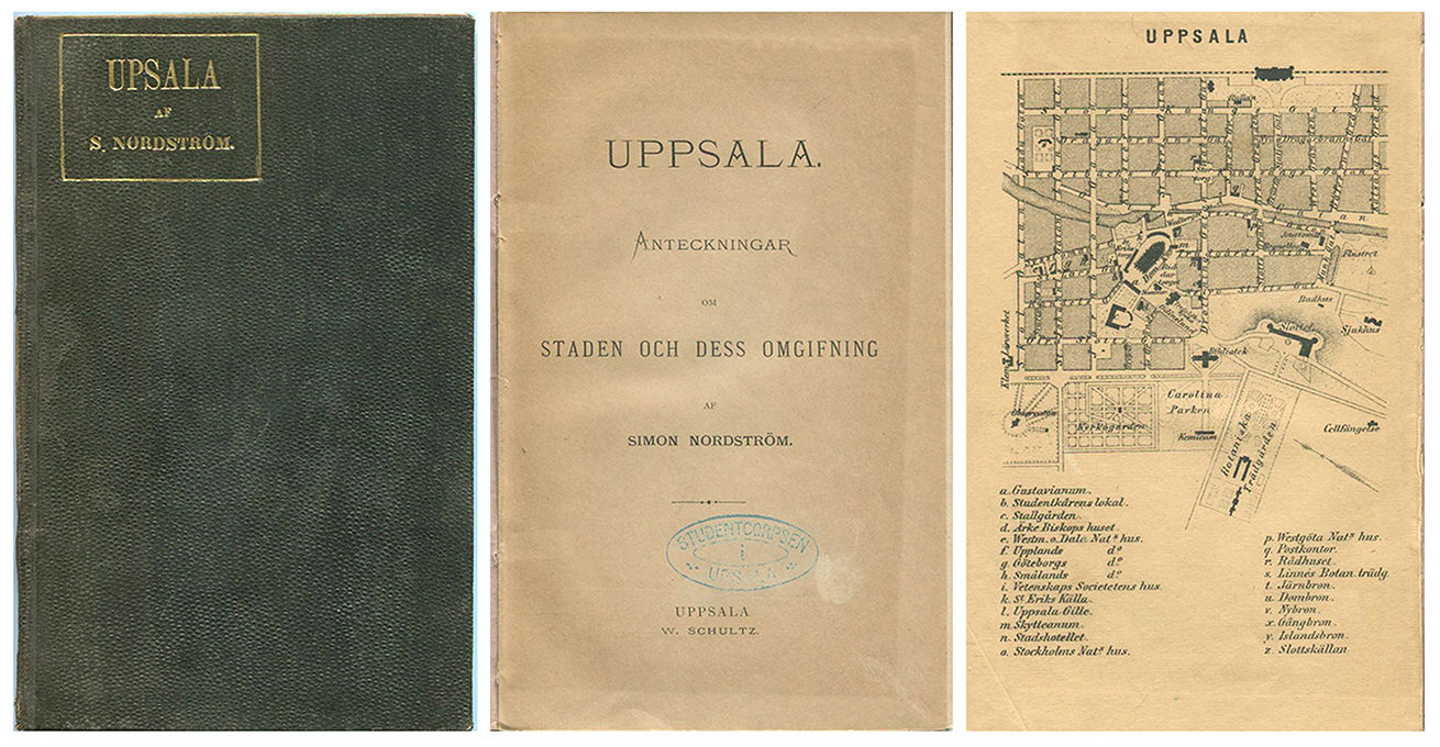 Bygdén Landskapet Upland och Stockholms stad s. 46. Skriften är en helt omarbetad och utvidgad version av Nordströms text till Alexander Nays ”Upsala i taflor” från 1870. Kartan är tryckt på det gula bakre omslagets utsida avbildar de centrala delarna av Uppsala. De sista sidorna är en tidtabell över järnvägs- och ångbåtstrafiken till Uppsala samt förteckning över hotell, banker, konditorier, åkare m.m.
