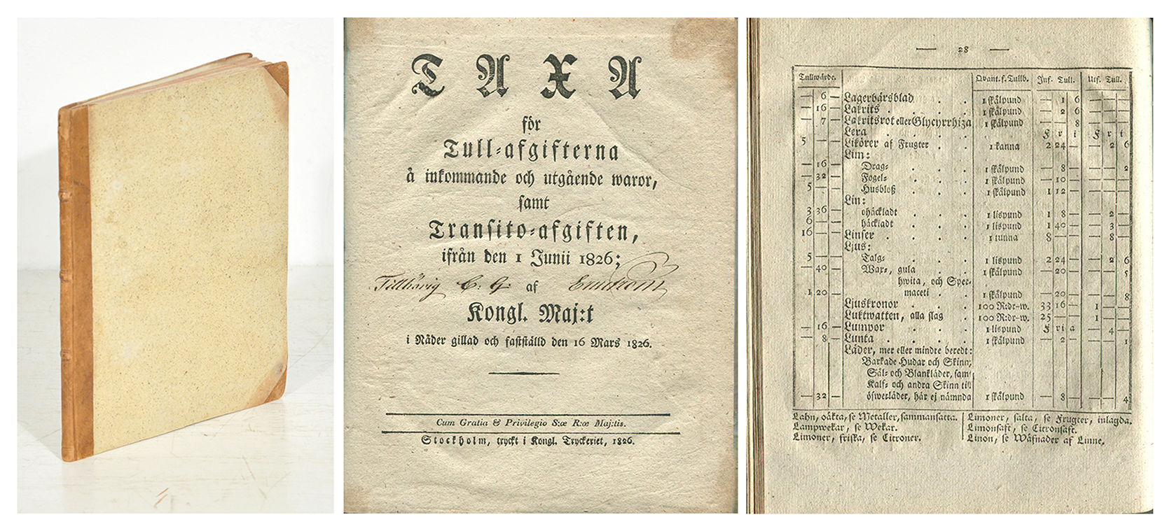 Taxa för tull-afgifterna å inkommande och utgående waror, samt transito-afgiften, ifrån den 1 junii 1826; af kongl. maj:t i nåder gillad och fastställd den 16 mars 1826.