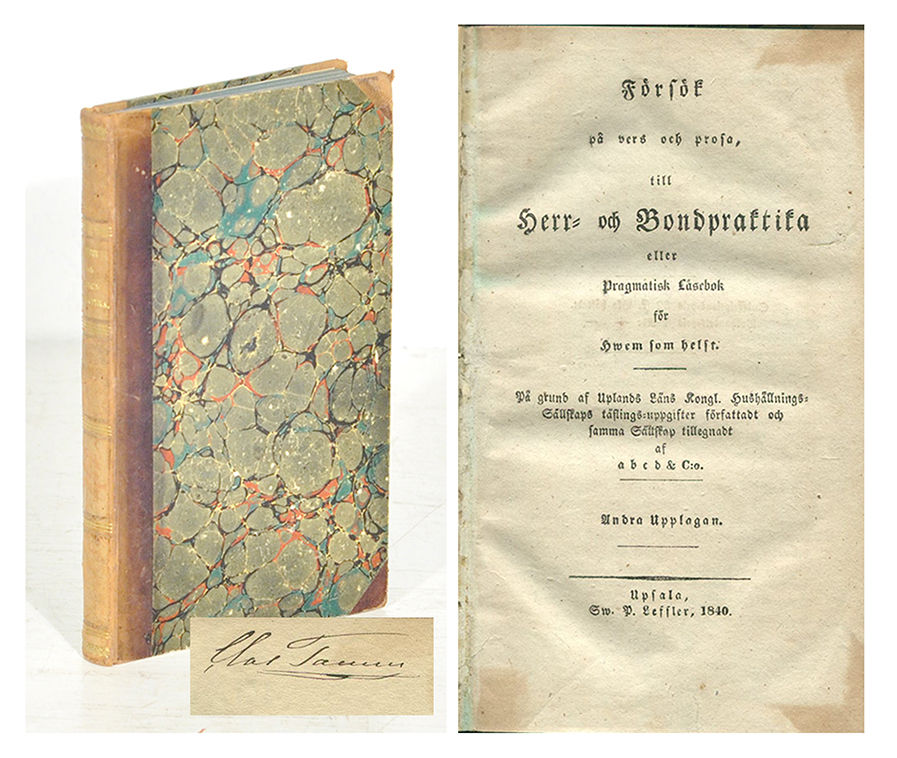 Uppsala, S. P. Leffler, 1840. 8:o. VIII,218 s. Samtida hfrbd med guld- och blindpressad dekor på den blekta ryggen. Tätt blåstänkta snitt. Bruntonade hörn på titelbladet och sista bladet. Namnteckning av Clas Tamm på försättsbladet.