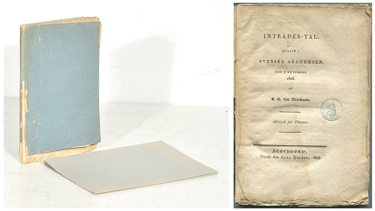 Separatupplaga ur ”Svenska akademiens handlingar”. Talarens ämne är en minnesteckning över Johan Adam Tingstadius, företrädaren på akademistolen. Denne nämns först på sidan 20 efter en inledning om vitterheten, akademien och Gustav III. Svar av Johan Olof Wallin från sidan 91. Carl Gustaf von Brinkman (1764-1847) var ämbetsman och diplomat, ledamot av både Svenska akademien och Vetenskapsakademien. Han debuterade som skönlitterär författare i Tyskland redan 1789 under pseudonymen ”Selmar”. På svenska framträdde han inte i vittra sammanhang förrän i mitten av 1820-talet och är mest känd som vän till Tegnér och andra författare. Brinkman var också en ivrig bok- och autografsamlare och byggde upp en av de finaste bok- och handskriftssamlingarna som funnits i Sverige. Biblioteket donerades efter hans död till Uppsala universitetsbibliotek och hans stora handskriftssamling placerades hos Trolle-Wachtmeister på Trolle-Ljungby i Skåne.