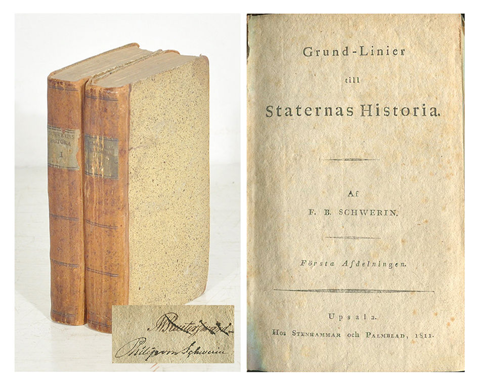 Uppsala, Stenhammar och Palmblad, 1811-13. 8:o. (8),339 s. & 5 utvikbara tryckta tabeller + (8),388 s. Två samtida ganska nötta hfrbd med svartlinjerade ryggar och gröna titeletiketter i lite olika nyans. Sprickor i andra volymens titeletikett. Lite fläckiga snitt. Till stor del lagerfläckiga. Med A. V. [?] Reuterswärds i del I överstrukna namnteckning och namnteckning av Philip von Schwerin.
