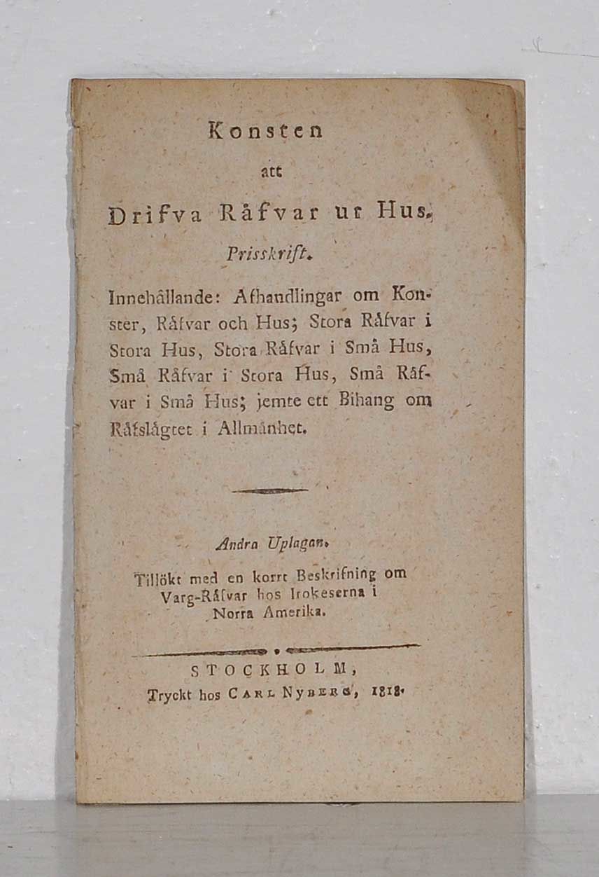 Konsten att drifva räfvar ur hus. Prisskrift. Innehållande: afhandlingar om konster, räfvar och hus; stora räfvar i stora hus, stora räfvar i små hus, små räfvar i stora hus, små räfvar i små hus; jemte ett bihang om räfslägtet i allmänhet. Andra uplagan. Tillökt med en korrt beskrifning om varg-räfvar hos irokeserna i Norra Amerika.