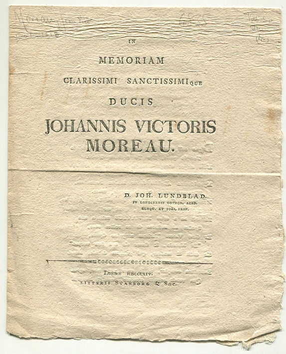 Jean Victor Marie Moreau (1763-1813) var fransk general som bland annat utmärkte sig 1794 under fälttåget i Nederländerna och därefter som chef för Rhenarmén 1796. Han blev avsatt 1797 misstänkt for delaktighet i Pichegrus förräderi. Moreau fick 1799 befälet över de franska styrkorna i Italien och hjälpte Napoleon Bonaparte under Brumairekuppen samma år. Han blev på nytt överbefälhavare över Rhenarmén och besegrade i december 1800 österrikarna i slaget vid Hohenlinden. Moreau ställde sig emellertid i opposition mot Napoleon, blev fängslad i februari 1804 och landsförvisad till USA. Han gick senare i allierad tjänst och blev dödligt sårad i slaget vid Dresden i augusti 1813. Johan Lundblad (1753-1820) var präst, professor, boktryckare och bokhandlare i Lund. Lundblads latinska diktning utgavs av hans son i Hamburg 1821.