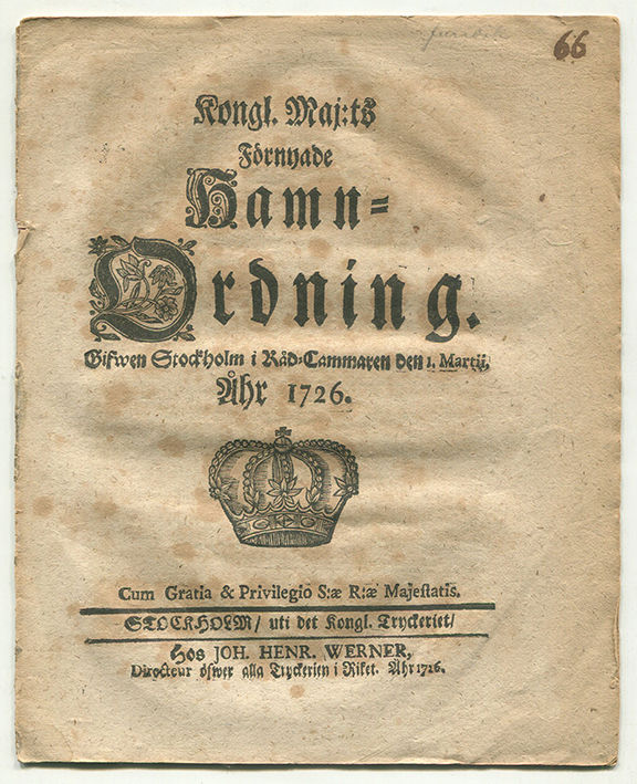 Sthlm, J. H. Werner, 1726. 4:o. (12) s. Tagen ur band. Med gammal bläckpaginering. Ganska lagerfläckig.