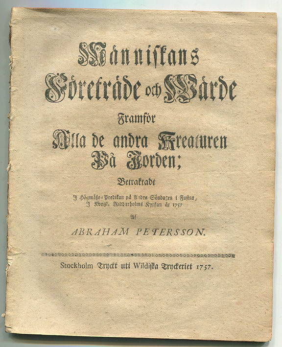 Människans företräde och wärde framför alla de andra kreaturen på jorden; betraktadt i högmässo-predikan på andra söndagen i faston, i kongl. Riddarholms kyrkan år 1757.