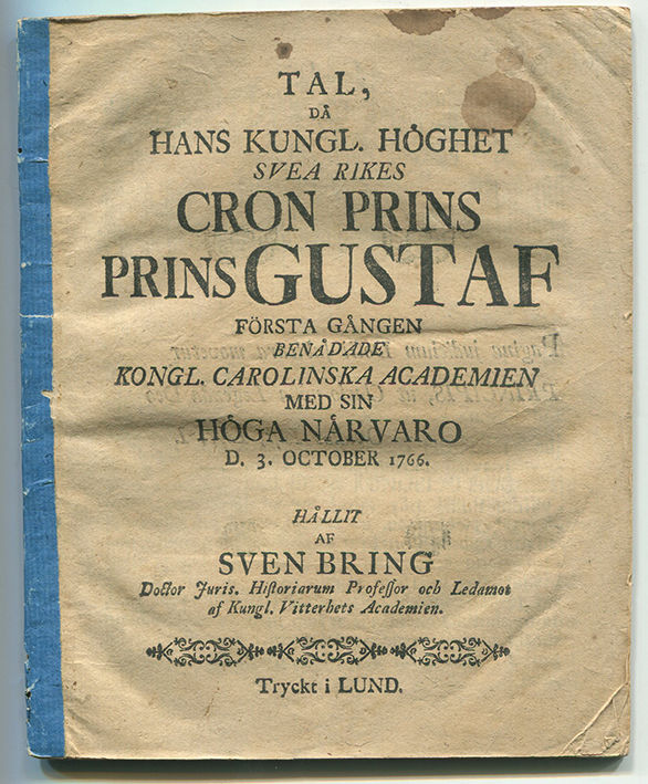 Tal, då hans kungl. höghet cron prins prins Gustaf första gången benådade kongl. carolinska academien med sin höga närvaro d. 3 october 1766.