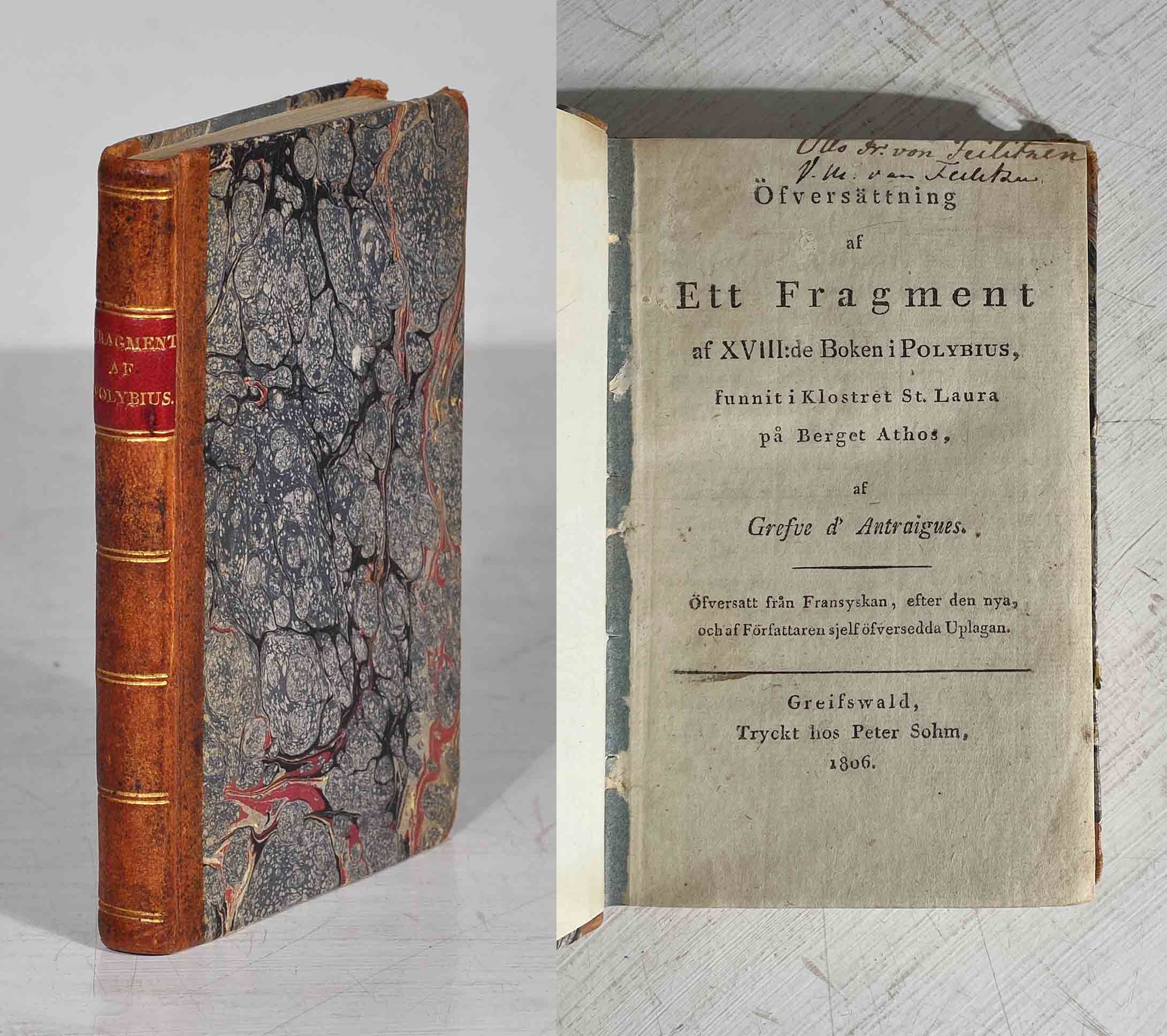 Greifswald, P. Sohm, 1806. 8:o. (8),167,(1 blank,4) s. Samtida hfrbd med guldlinjerad rygg och mörkröd titeletikett. Gula snitt. De två sista bladen fläckiga och sista bladet solkigt och med trista lagningar samt textförluster. Otto Fr. von Feilitzens och V. M. von Feilitzens namnteckningar överst på titelbladet. Exlibris M. von Feilitzen på Åkerstad.