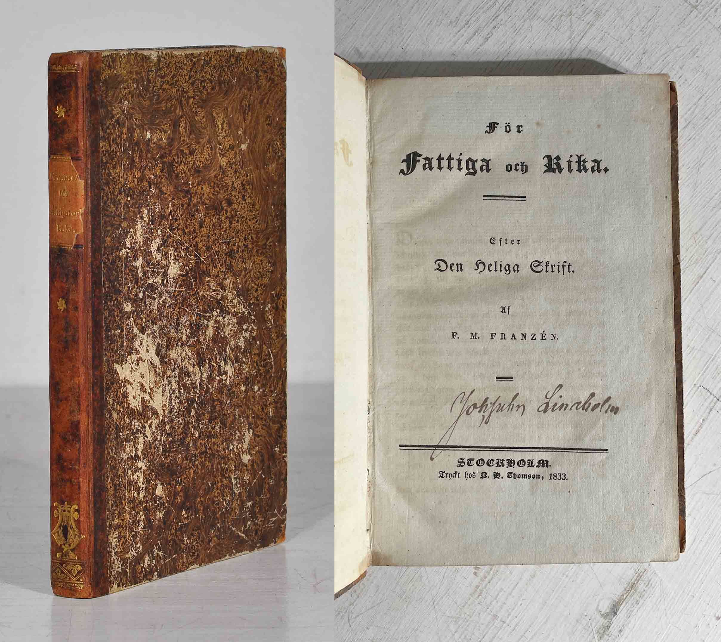 Sthlm, N. H. Thomson, 1833. 8:o. (6),215,(1) s. Något nött samtida brunt hfrbd med guldornerad rygg med guldlyra nederst och ljusbrun titeletikett vilken är naggad i tre av hörnen. Stänkta snitt. Pärmarna med en del smårepor. Bra inlaga med ett fåtal småfläckar. Namnteckning Joh.sohn Linaholm på titelbladet. Liten namnteckning Ad. Emelé på bakpärmens insida.