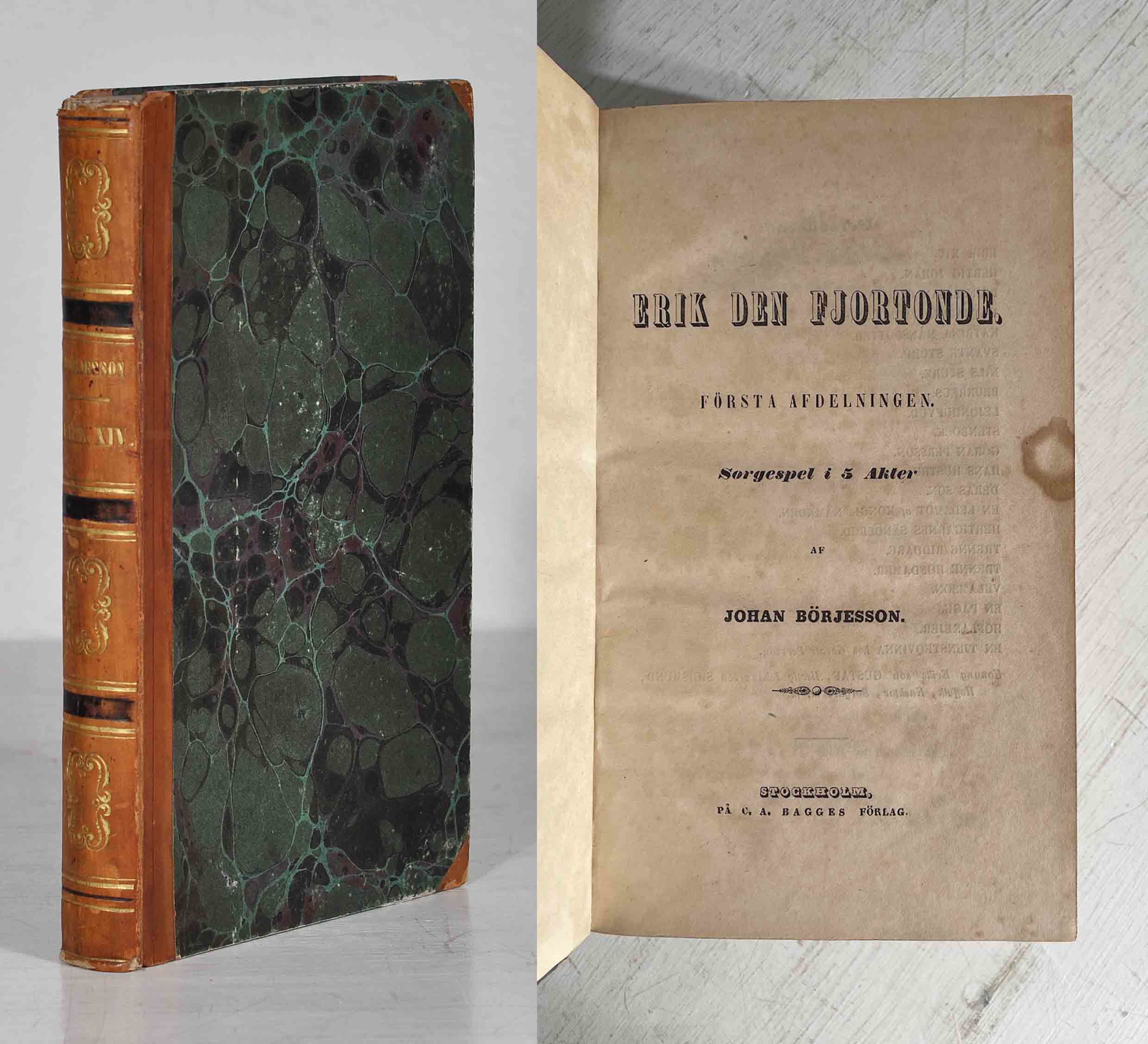 Sthlm, P. A. Norstedt & söner, 1846. 8:o. (2),170 s. + BÖRJESSON, JOHAN. Erik XIV:s son. Sorgespel i fem akter. Sthlm, Hörbergska tryckeriet, 1847. 8:o. 168 s. Samtida brunt hfrbd med guldornerad rygg vilken även har tre infärgade svarta band. Blåstänkta snitt. Med nagg i ryggändarna. Bortklippt namnteckning överst i försättsbladet. Stark fläck i första titelbladets yttermarginal. Båda pjäserna till stor del bruntonade och lagerfläckiga.