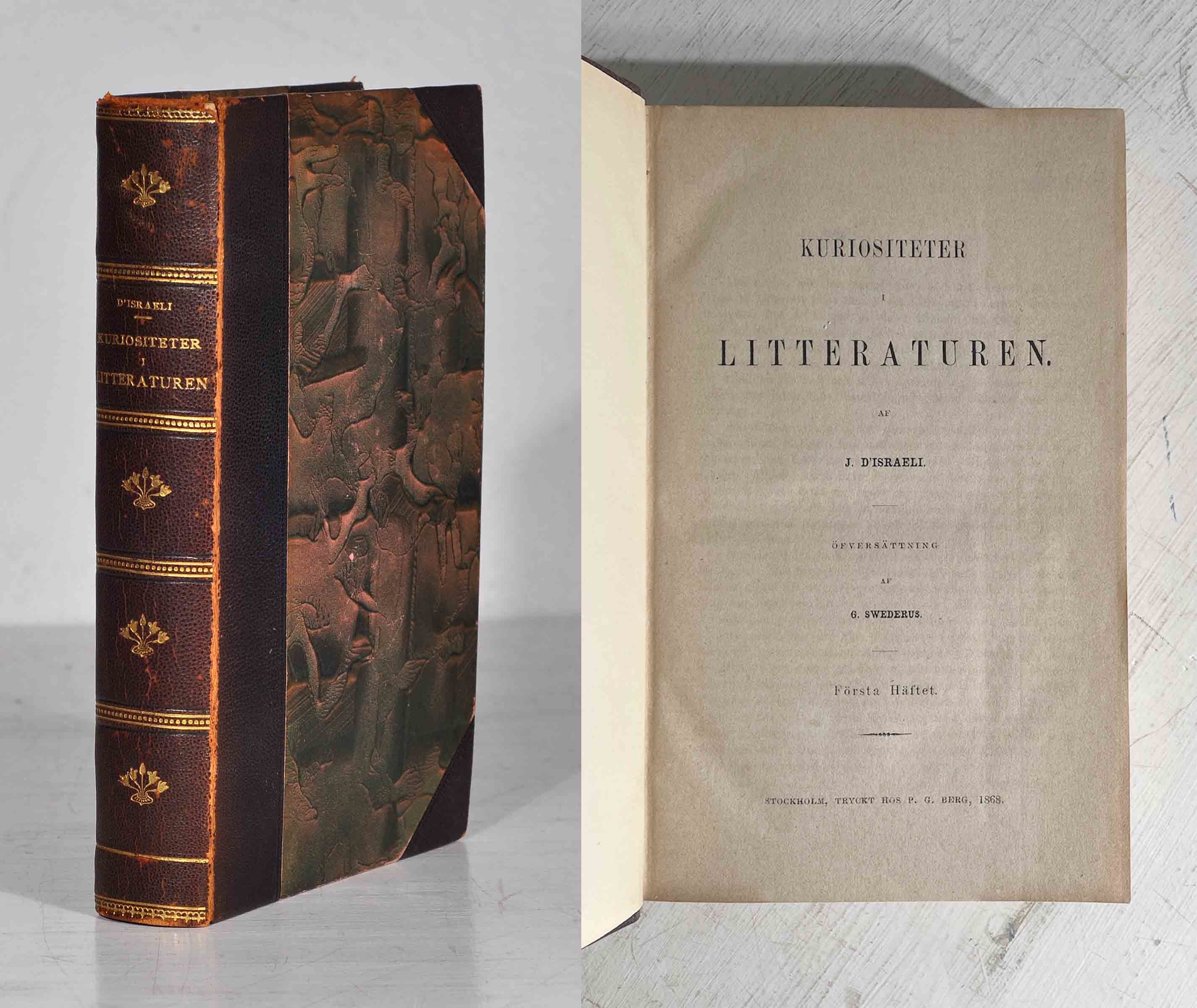 Avslutas med ett omfattande register till alla delarna. Första delen inleds med kapitlen ”Bibliotheker”, ”Bibliomani”, ”Litterära journaler”, ”Upptäckten af manuscripter” och fortsätter med bland annat ”Boktryckets tidigaste början”, ”Tryckfel”, ”Litterära beskyddare och befordrare”, ”Åldriges framsteg i nya studier”, ”Litterära bedrägerier”, ”Fysiognomik” och ”Uppkomsten af tidningar”. Isaac D’Israeli (1766-1848), brittisk-judisk författare, som var far till den brittiska premiärministern Benjamin Disraeli.