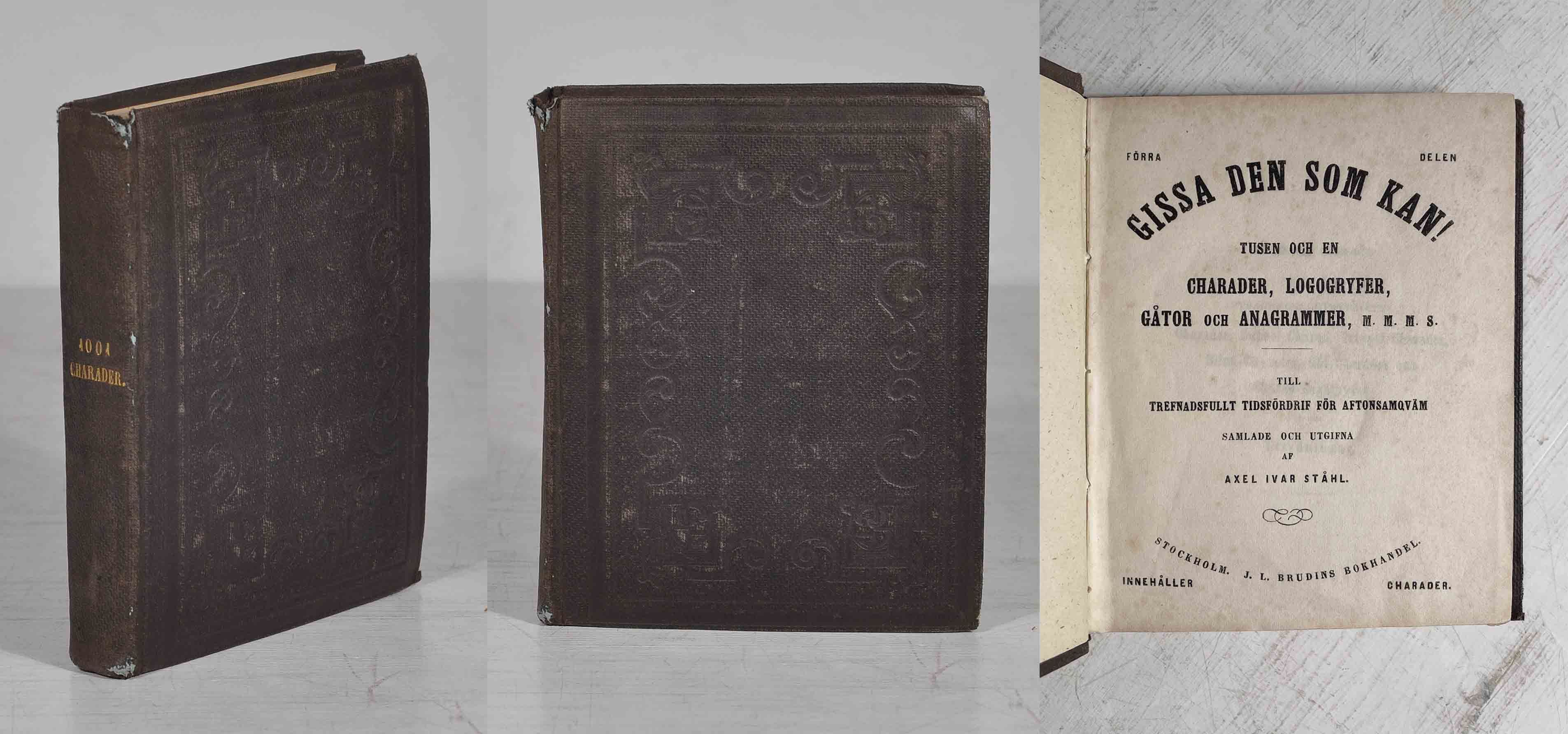 Sthlm, N. Marcus, 1856. Liten 8:o. (4),192,(1),210-16 + (4),150,(1 blank,1) s. Samtida mörkbrunt oklbd med blindpressade ramverk på pärmarna och guldtryckt titel ”1001 charader” på ryggen. Med smånötningar på ryggen och smånagg i ryggändarna. Ställvisa lätta lagerfläckar. Större brunfläck på s. 57-66 och 81-84 i andra delen.