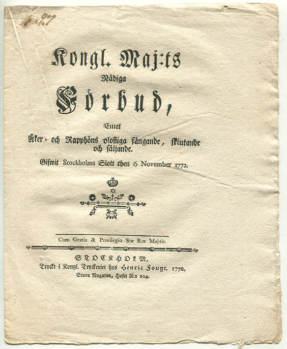 Kongl. maj:ts nådiga förbud, emot åker- och rapphöns olofliga fångande, skiutande och säljande. Gifwit Stockholms slott then 6 november 1772.