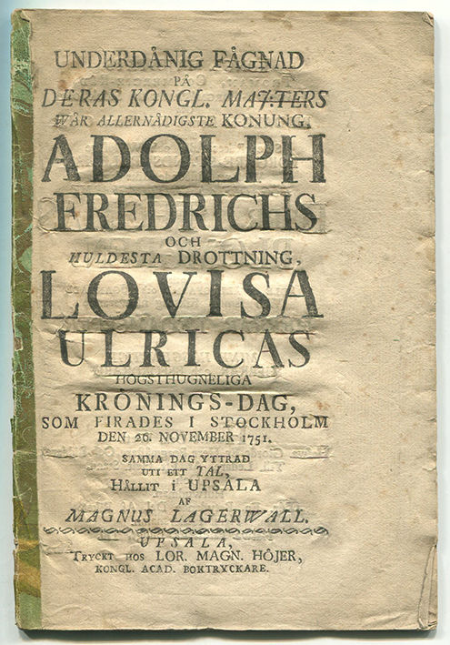Underdånig fägnad på deras kongl. maj:ters wår allernådigste konung, Adolph Fredrichs och huldesta drottning, Lovisa Ulricas högsthugneliga krönings-dag, som firades i Stockholm den 26. november 1751. Samma dag yttrad uti ett tal, hållit i Upsala.