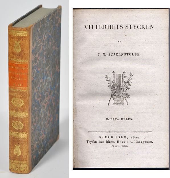 Sthlm, H. A. Nordström, 1827-29. 8:o. (8),184 + (4),192 s. Ngt nött samtida hfrbd med guldornerad och svagt blindpressad rygg, brandröd titeletikett och grönstänkta snitt. Ryggen lite flammig. Bra inlaga med några enstaka småfläckar i del I. En och annan diskret rättelse med blyerts. En mindre pappersförlust i yttermarginalen på s. 105 i del I. En samtida namnteckning på främre pärmens insida.