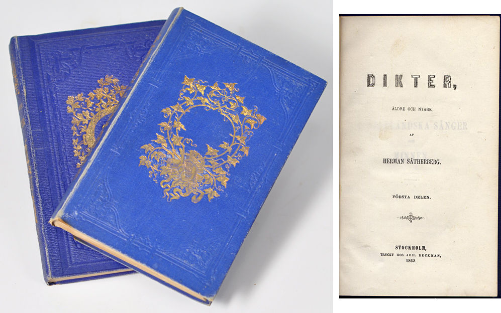 Sthlm, J. Beckman, 1862-63. 8:o. 311,(1) + 275,(1) s. Två samtida koboltblå dekorerade oklbd vars inbördes orneringar och guldpräglingar skiljer sig ngt åt. Del II har en aningen blekare färgton. Denna del även med ett brännmärke nedtill vid den bakre falsen och är etikettsignerad av I. Elkan, bokbindare i Stockholm. Del I har några sporadiska lager- och småfläckar men även några tråkiga avtryck av blommor som fått tjäna som bokmärke på s. 106-12. Med Anna Wåhlins namnteckning och Silluf och Bengt-Olof Landins exlibris.
