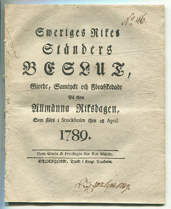 Sweriges rikes ständers beslut, gjordt, samtyckt och förafskedadt på then allmänna riksdagen, som slöts i Stockholm then 28 april 1789.