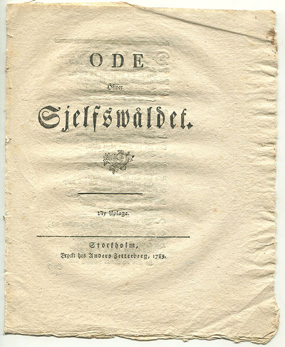 Sthlm, A. Zetterberg, 1789. 4:o. (4) s. Oskuren med hål efter tidigare häftning i ryggmarginalen. Några spridda småfläckar. Bra ex.