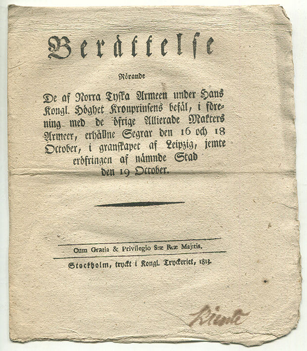 Berättelse rörande de af norra tyska armeen under hans kongl. höghet kronprinsens befäl, i förening med de öfrige allierade makters armeer, erhållne segrar den 16 och 18 october, i granskapet af Leipzig, jemte eröfringen af nämnde stad den 19 october.