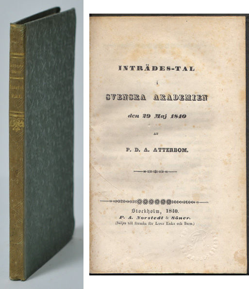 Sthlm, P. A. Norstedt & söner, 1840. 8:o. (2),123,(1) s. Grönt samtida mönsterpressat klbd med sparsamt guldornerad rygg och marmorerade snitt. Ryggen blekt och med några småskavanker upp- och nedtill. Inlagan ställvis lagerfläckad. En liten fuktfläck i övre marginalen från s. 115 till slutet. Med C. A. W. Keys och A. A. Sjögrens namnteckningar, den senare daterad 1890. Med en privat blindstpl i nedre yttre hörnet på försätts- och titelbladet.