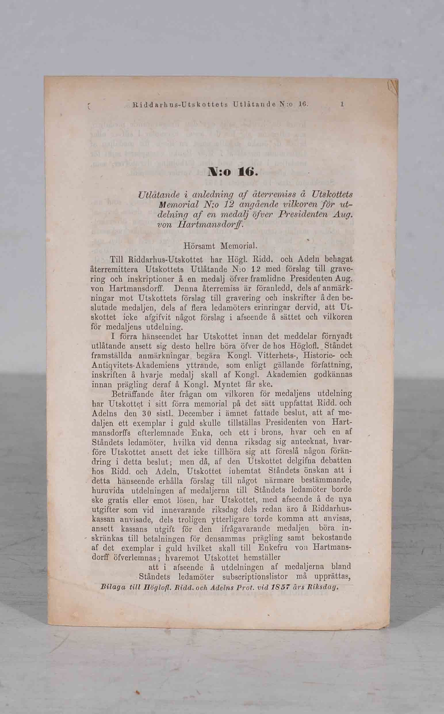 N:o 16. Utlåtande i anledning af återremiss å utskottets memorial n:o 12 angående vilkoren för utdelning af en medalj öfver presidenten Aug. von Hartmansdorff. [=rubrik].