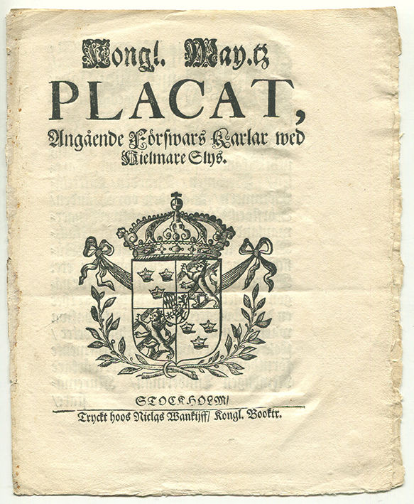 Kongl. may.tz placat, angående förswars karlar wed Hielmare slys.