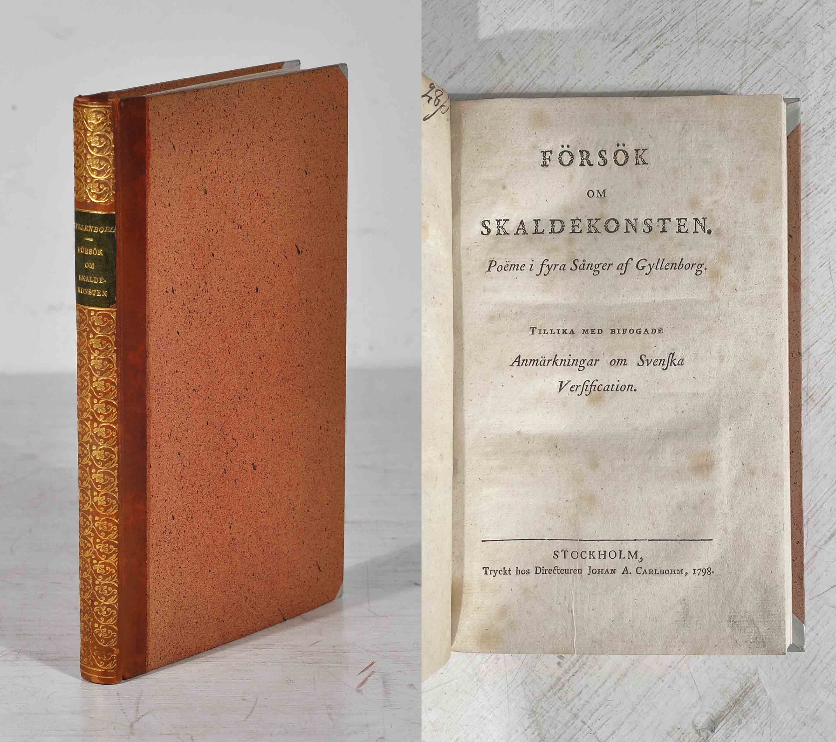 Sthlm, J. A. Carlbohm, 1798. 8:o. (4),103,(1) s. Brunt hfrbd från 1900-talets mitt i gammal stil med rikt guldornerad rygg och grön titeletikett. Svagt stänkta snitt. Ett gammalt gråpappersomslag medbundet. Enstaka småfläckar. Titelbladet något lagerfläckigt. På främre omslagets baksida numrering och äldre namnteckning J. A. Paqualin samt senare blyertsanteckning om Gyllenborg. Exlibris Gunnar Fredrikson.