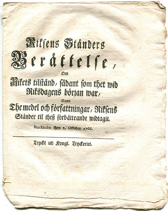 Riksens ständers berättelse, om rikets tilstånd, sådant som thet wid riksdagens början war, samt the medel och författningar, riksens ständer til thess förbättrande widtagit. Stockholm then 2 october 1766.