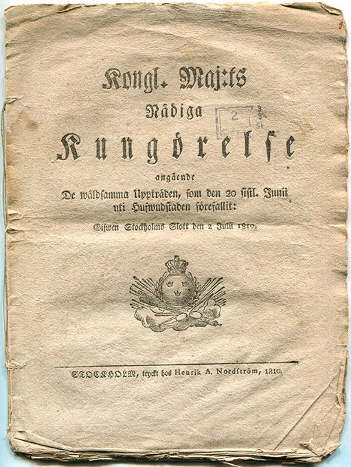 Kongl. maj:ts nådiga kungörelse angående de wåldsamma uppträden, som den 20 sistl. junii uti hufwudstaden förefallit: gifwen Stockholms slott den 2 julii 1810.