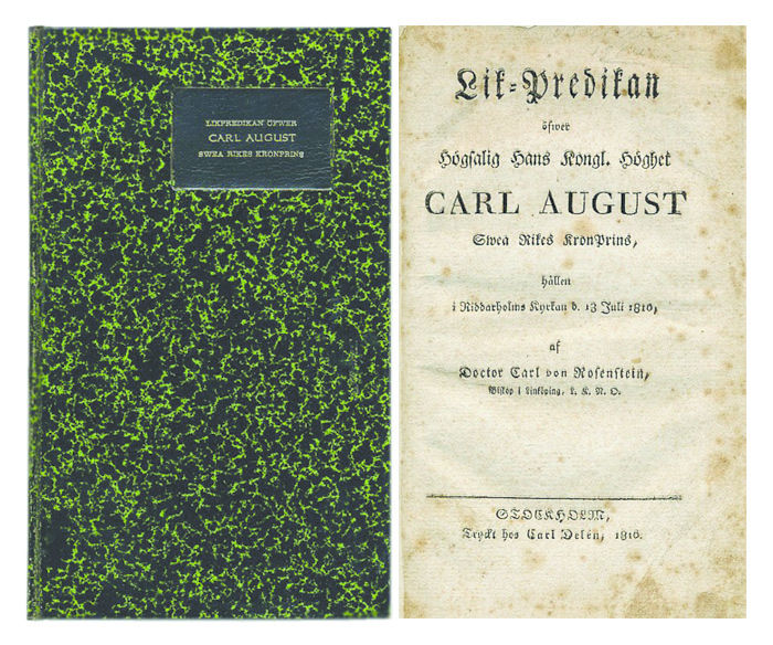 Sthlm, C. Delén, 1810. 8:o. 13,(3 blanka) s. + (ROSENSTEIN, NILS von) Personalier öfver högstsalig hans kongl. höghet Carl August, Svea rikes kron-prins. Sthlm, H. A. Nordström, 1810. 8:o. 24 s. Grönmarmorerat pappbd med svart titeletikett av skinn på främre pärmen (A. Nilsson). Kraftigt lagerfläckiga.