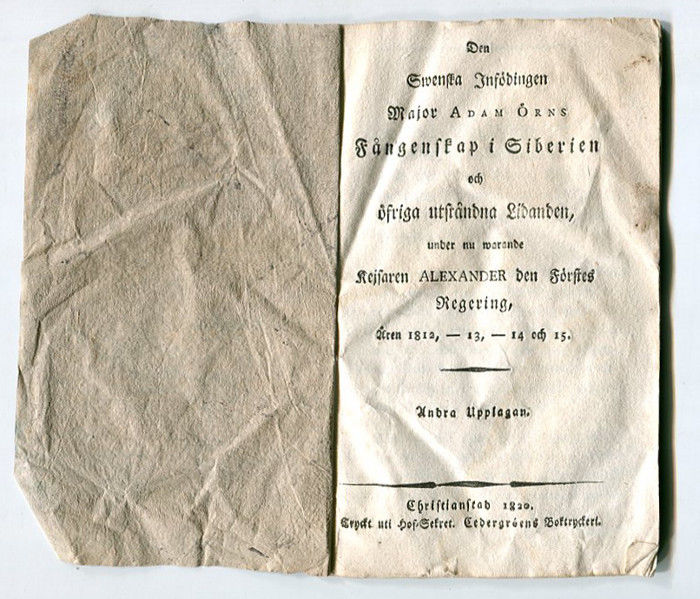 Den svenska infödingen major Adam Örns fångenskap i Siberien och öfriga utståndna lidanden, under nu warande kejsarens Alexander den förstes regering, åren 1812, -13, -14 och 15. Andra upplagan.