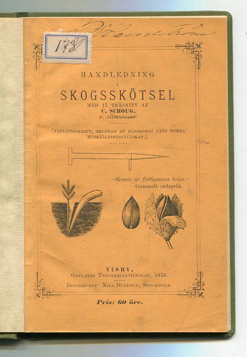 Handledning i skogsskötsel med 17 i texten intryckta träsnitt. (Täflingsskrift, belönad af Elfsborgs läns norra hushållningssällskap).