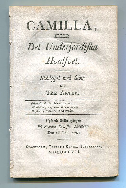 Camilla, eller det underjordiska hvalfvet. Skådespel med sång uti tre akter. Originalet af herr Marsollier. Öfversättningen af herr Envallsson. Musiken af riddaren D’Aleyrac. Upförd första gången på Svenske comiske theatern den 28 maji 1797.