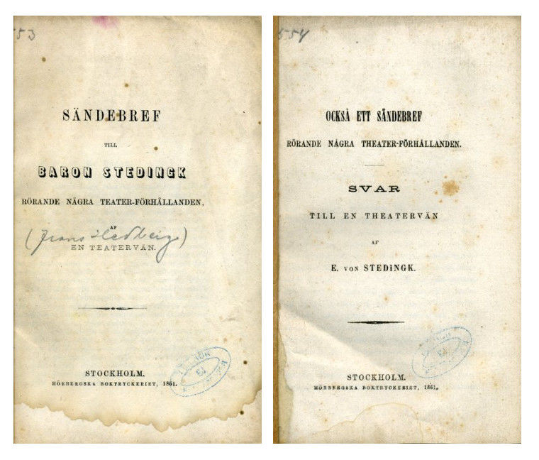 Sthlm, Hörbergska boktryckeriet, 1861. 8:o. 34,(2) s. + STEDINGK, E. von. Också ett sändebref rörande några theater-förhållanden. Svar till en theatervän. Sthlm, Hörbergska boktryckeriet, 1861. 8:o. 39,(1) s. Häftade, oskurna och delvis ouppskurna och insatta i varsitt brunt, missfärgat och solkigt enkelt pappomslag. Hedbergs arbete med genomgående stark fuktrand i nedre marginalen. Stedingks arbete något fläckigt och med ett veck i nedre ryggmarginalen. Författarnamnet tillskrivet på titelbladet till Hedbergs arbete. Stpl ”Georg Asserlind Solhagen” på båda främre omslagen.
