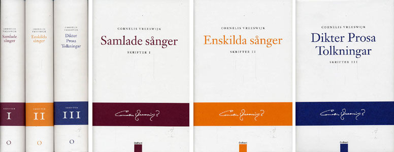 Ordfront, 2000. Tre volymer, 442 + 524 + 668 s. Klotband med skyddsomslag. Förlagsny. Del 1 Samlade sånger, del 2 Enskilda sånger, del 3 Dikter Prosa Tolkningar. Utgivna av Jan Erik Vold.
