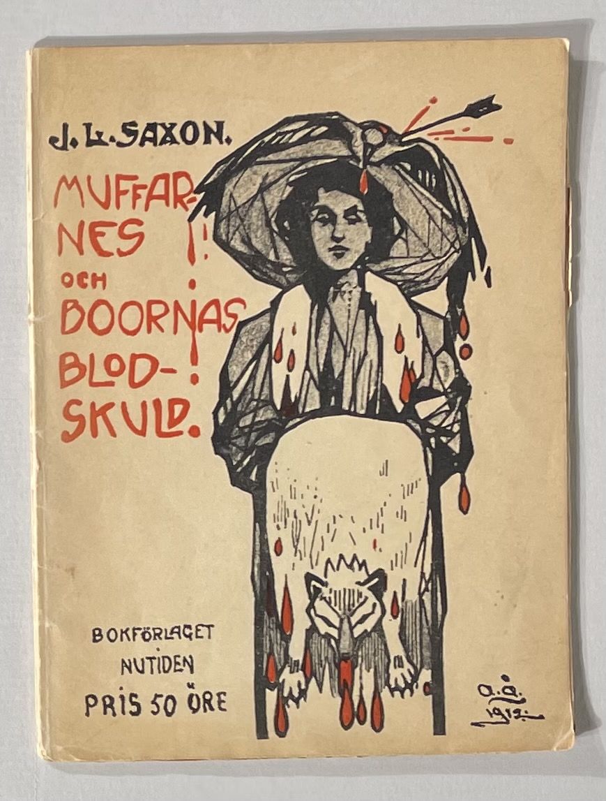 Stockholm, Linkoln Bloms Boktryckeri Akt.-Bol., 1913. 31 s. Häftad. Oskuren. Bakre omslaget med en mängd fula fläckar. Utgiven av bokförlaget Nutiden. Rikt illustrerad. Tidig antipälspropaganda. Johan Lindström Saxon var intiativtagare till Svenska vegetariska föreningen, dess första ordförande och redaktör för tidskriften ”Vegetarianen”. Sista sidan med reklam för ”Imiterat pälsvärk” i olika modeller, vilka kunde införskaffas från Svenska vegetariska föreningens expedition på Jakobsgatan 22B i Stockholm.