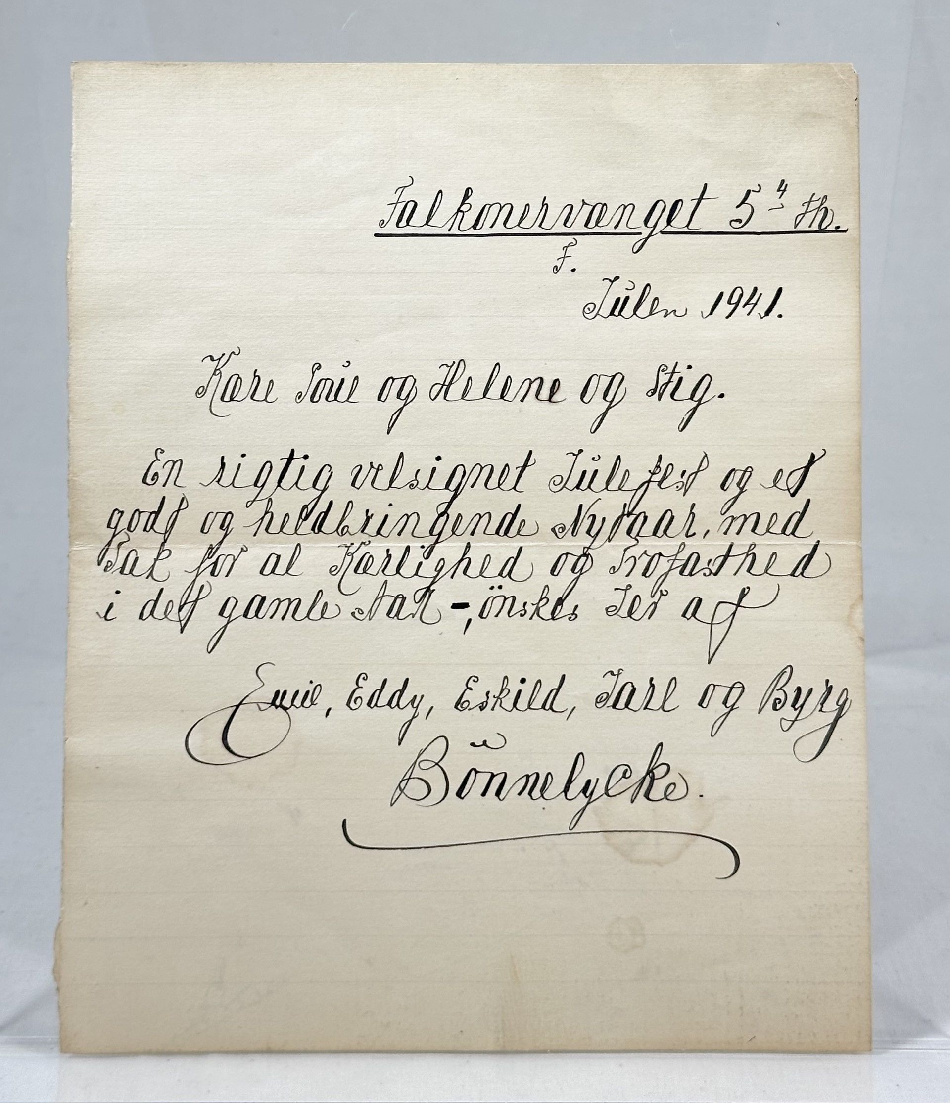 En højstemt julehilsen til familien Bønnelycke til Emils bror og familie, dateret Julen 1941. Én side, foldet. Skriblerier og tegninger på bagsiden.