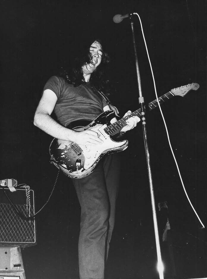 * Rory Gallagher with his Stratocaster on stage in Copenhagen, ca. 1971.