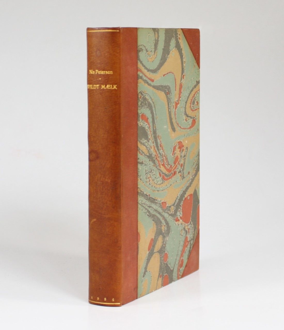 Gyldendal, København 1934. 1. oplag. 245 sider. Indbundet ubeskåret med orig. for- og bagomslag, ryg samt smudsomslagets for- og bagsiden i et smukt halvbind af brunt kalveskind. Exlibris. Smudsomslaget med kantreparationer. Ryggen let plettet.