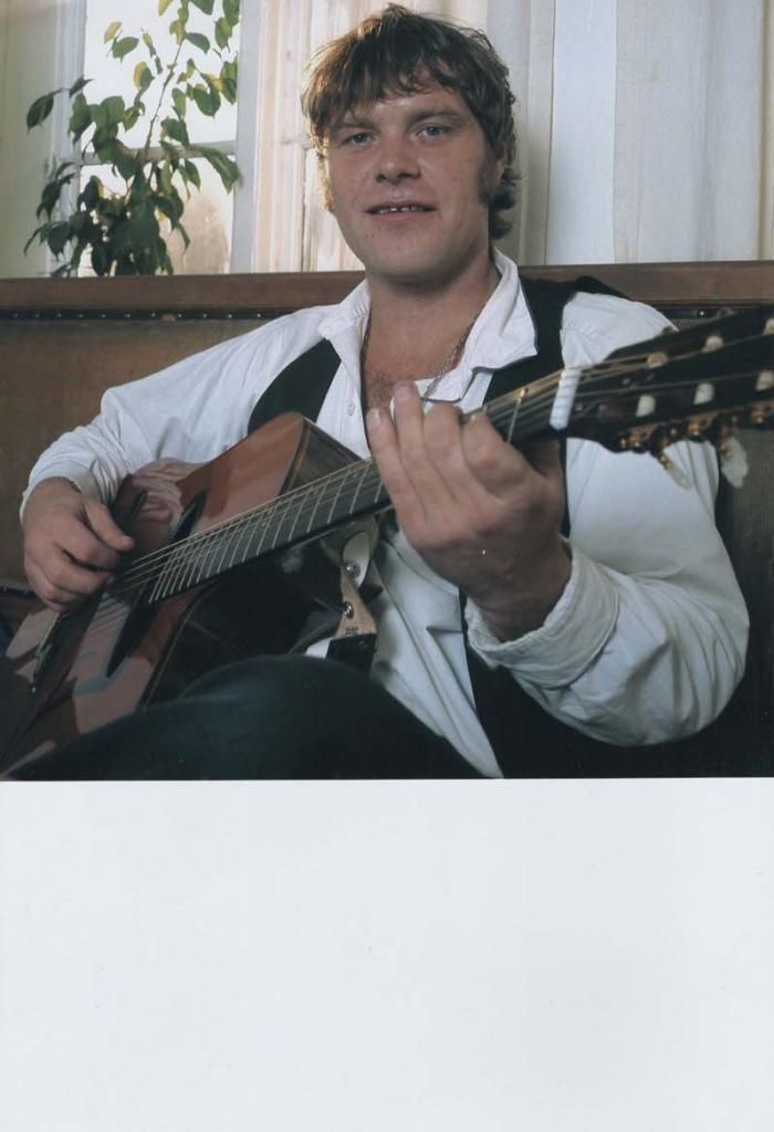 * Lead singer Kim Larsen of the Danish band Gasolin ca. 1978 seated holding an acoustic guitar.