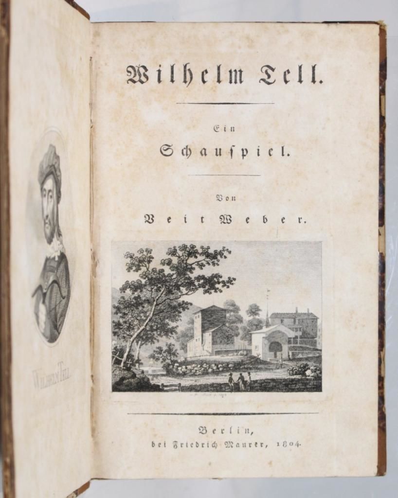 Friedrich Maurer, Berlin 1804. Frontespiece portrait (of Tell)+engraved titleleaf+ 256 pages. Simple, early 20th century half cloth binding with black paper spine title.Bookplate.