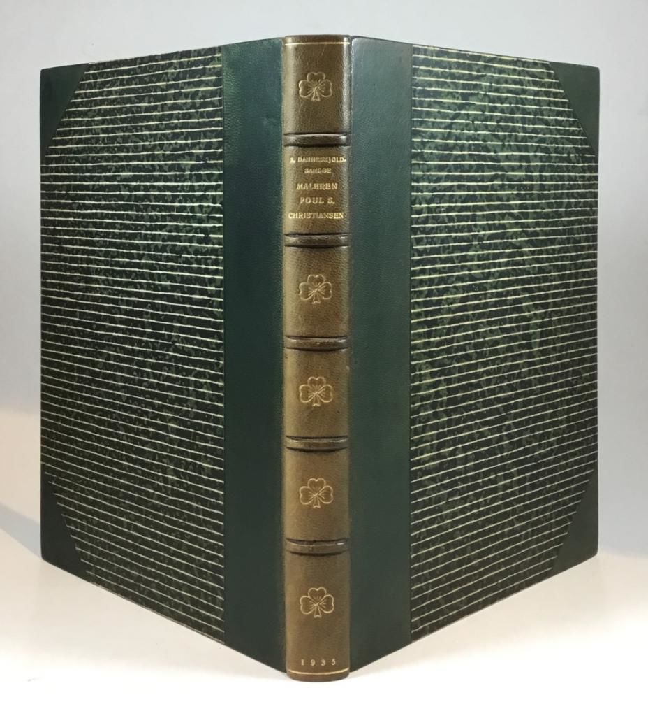 Rasmus Navers Forlag, København 1935. 4to. 257 sider. Illustreret i s/h. Indbundet ubeskåret med orig. omslag i et elegant halvbind af grønt gedeskind med rygforgyldning og topguldsnit (Juul-Lassen). Ryggen let falmet.
