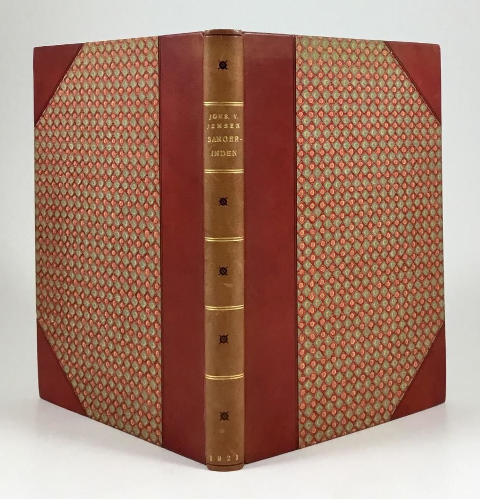 Gyldendal, København 1921. 1. udgave. 131 sider. Indbundet ubeskåret med orig. omslag i et elegant samtidigt halvbind af rødbrunt gedeskind med rygforgyldning og grafit-topsnit (Juul-Lassen). Exlibris (advokat Harald Pedersen). Ryggen let falmet.