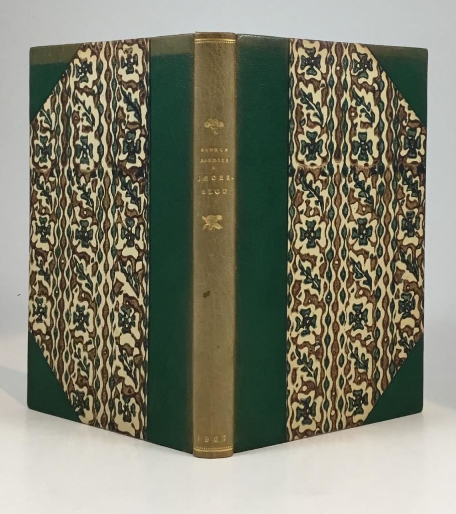 Gyldendal, København 1907. 125 sider. Indbundet ubeskåret med orig. omslag i et kønt halvbind af grønt gedeskind med rygforgyldning (Juul-Lassen). Ryggen falmet.