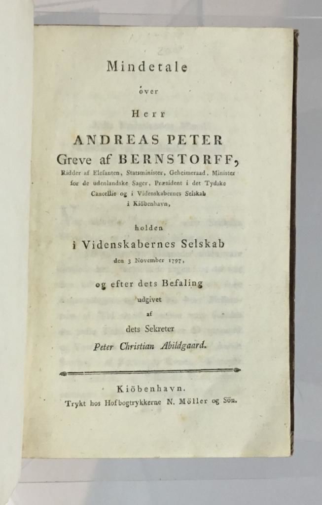* Mindetale over udenrigsminister Bernstorff [1735-1791], holdt af lægen og veterinæren P.C. Abildgaard, bror til den navnkunde maler Nicolai Abildgaard.