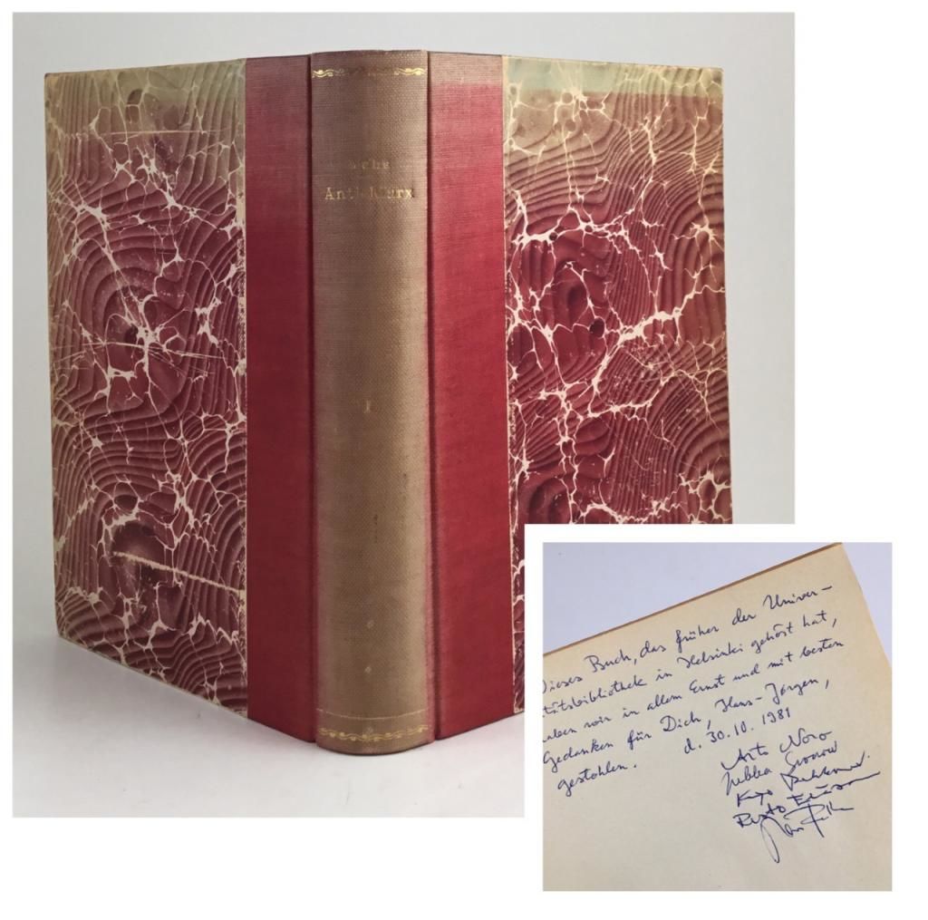 * All published. Inscribed for Danish philosophy professor Hans-Jørgen (Schanz) and signed with 5 Finnish names, stating in German that the book was stolen at the Helsinki University Library especially for him (1981).