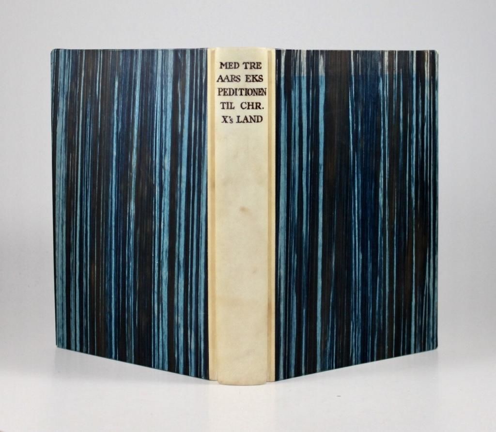 Gyldendal, København 1937. 282 sider. Illustreret med fotos i s/h. Med foldet kort over Østgrønland. Indbundet ubeskåret i et smukt halvbind med ryg og hjørner af pergament (Mogens Thomsen).