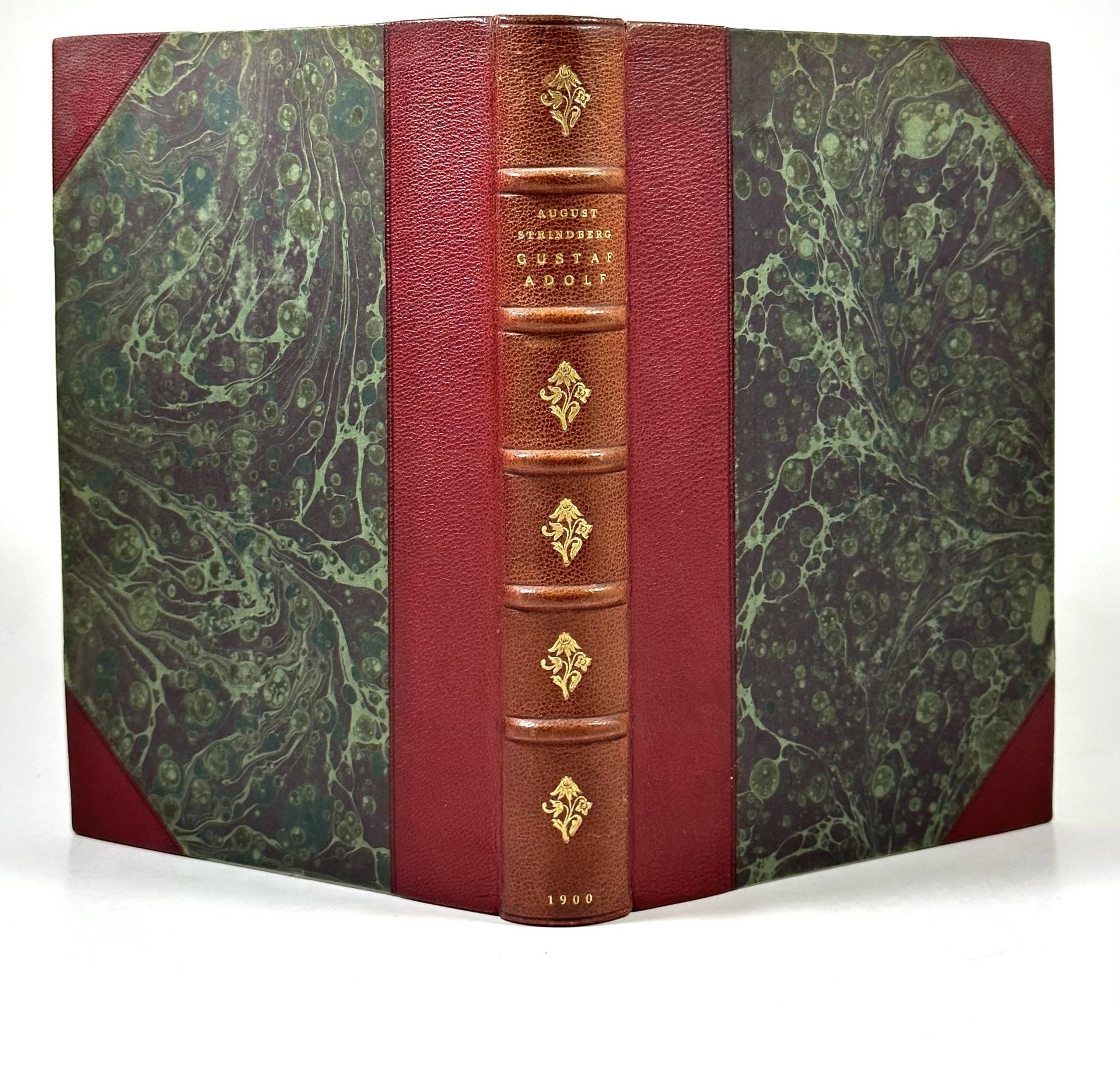 Gernandts, Stockholm 1900. 386 sider. Indbundet ubeskåret med orig. omslag i et smukt halvbind af rødbrunt gedeskind med rygforgyldning og topguldsnit (Anker Kyster). Navn på fribladet.