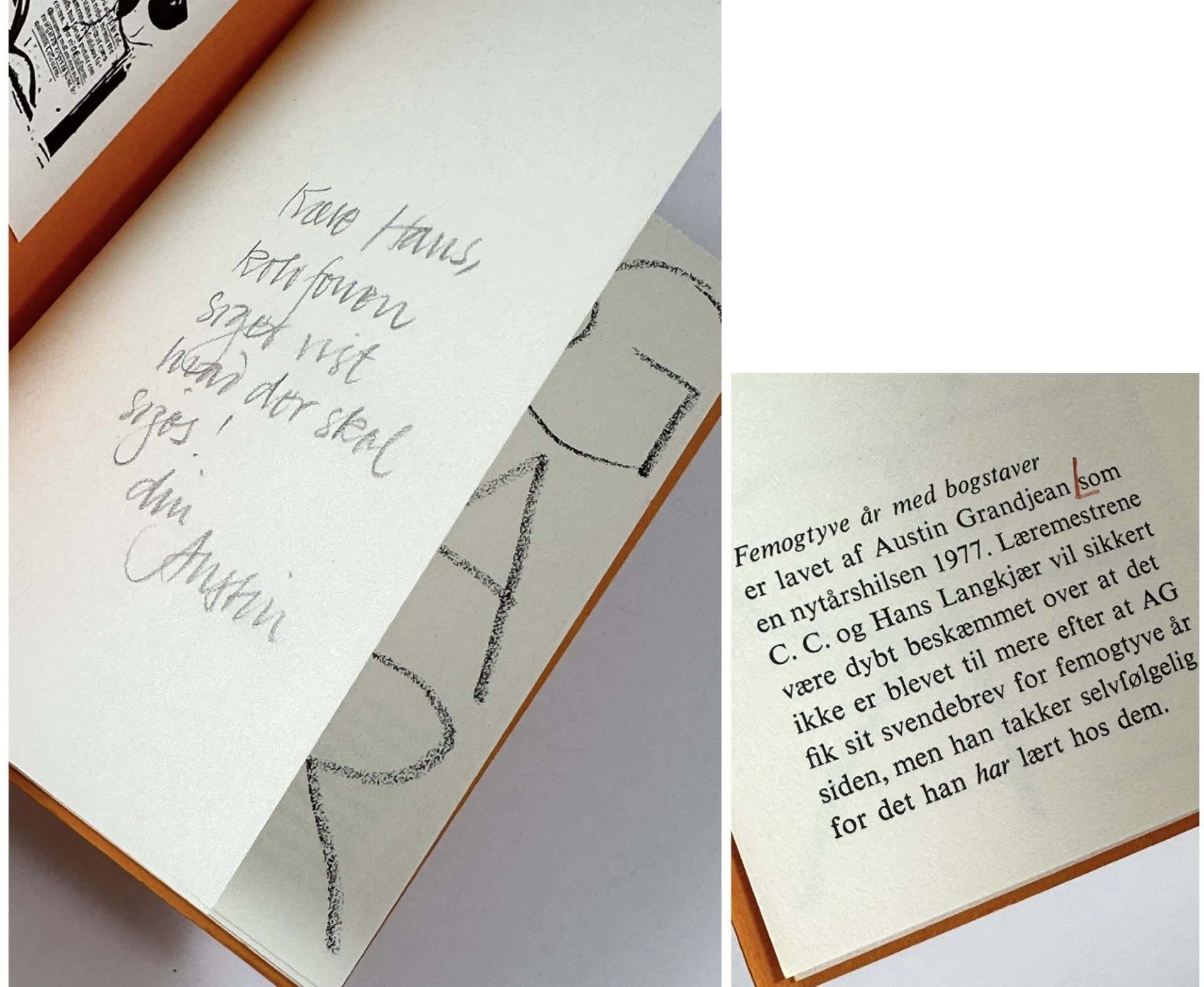 * Med dedikation ffraq Austin Grandjean til bogtrykker Hans Langkjær - én af Grandjeans læremestre. **En lille grafisk lækkerbisken fra Gyldendals store bogtilrettelægger gennem en menneskealder.